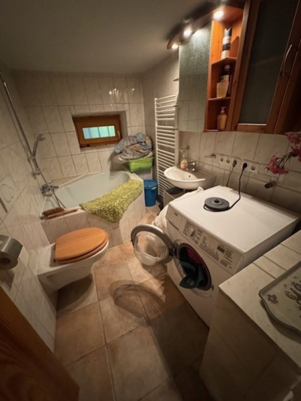 Im OG befindet sich ein größeres Wohnzimmer mit Küche. Daneben ist ein Appartement mit 2 Zimmern und WC/ Dusche im Gang (eigener Zugang vom Treppenhaus).